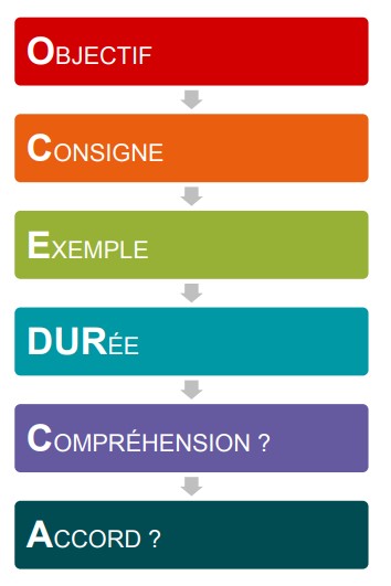 Cet OCÉDURÇA est ce qui permet lors du lancement d’une séquence pédagogique d’en identifier le sens. En tant que formateurs, nous avons tout intérêt à l’écrire sur un paperboard ou un tableau pour que les apprenants puissent s’y référer tout au long de l’activité le cas échéant.