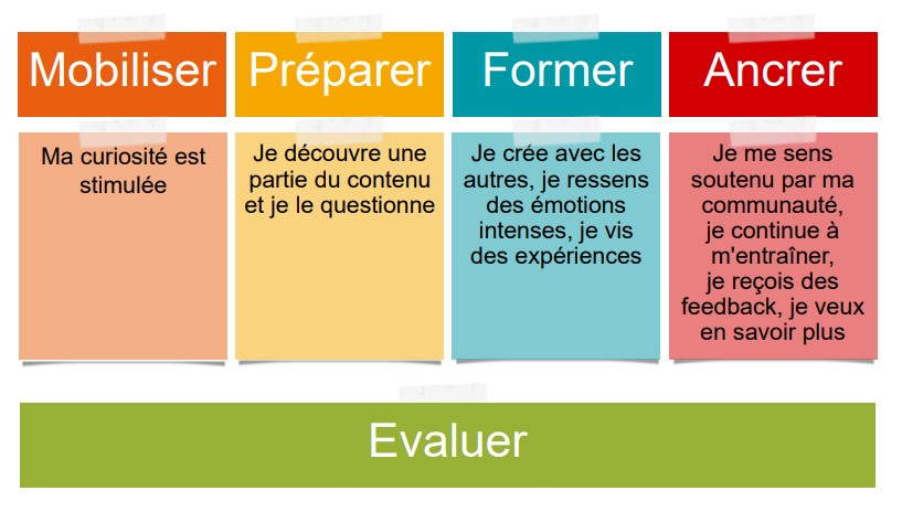 Lors de la réponse au cahier des charges de la demande de formation (cf. A.V.E.C. ou la Démarche Contractuelle par Objectifs), nous pouvons alors utiliser plusieurs de ces modalités pédagogiques. Nous le savons, une action de formation s’inscrit dans le temps au sein duquel nous allons retrouver une alternance de plusieurs modalités pédagogiques. En complément de la carte mentale en tête de cet article, nous vous proposons de vous illustrer concrètement à quoi peuvent servir ces modalités pédagogiques dans un parcours hybride, c’est-à-dire utilisant au moins deux modalités pédagogiques différentes.