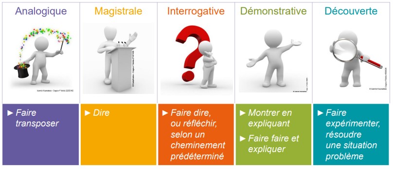 Toutes ces méthodes sont pertinentes selon les situations d’apprentissage. Aux deux extrêmes de l’implication des apprenants, nous trouvons la méthode magistrale (méthode qui implique le plus de passivité de la part des apprenants) et la méthode découverte (méthode qui implique d’emblée les représentations des apprenants en les rendant acteurs dans la situation d’apprentissage).