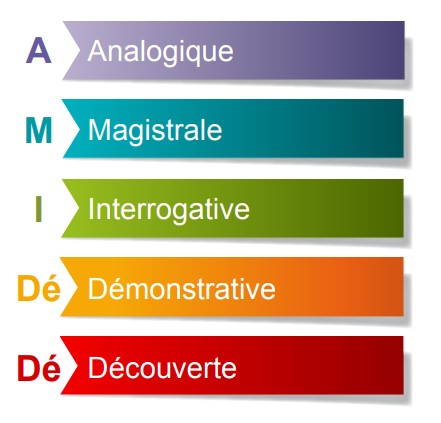 Selon les situations de formation, il est pertinent de diversifier les méthodes pédagogiques. Nous repérons 5 méthodes pédagogiques : Analogique, Magistrale, Interrogative, Découverte, Démonstrative soit l’AMIDéDé.